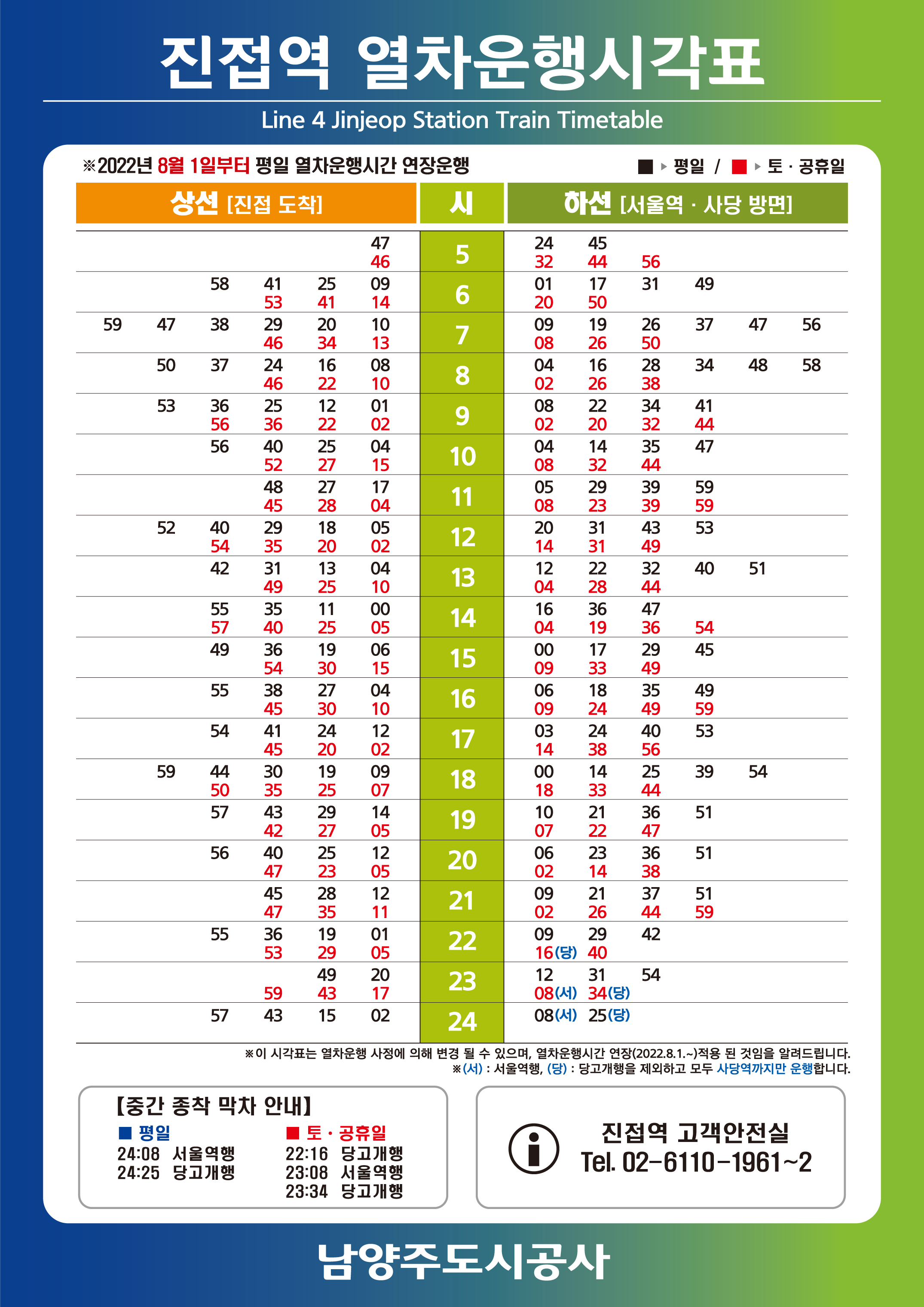 2022. 8. 1.(월)부터 평일 심야시간대 열차운행 시간이 아래와 같이 각 역사별 운행시간이 조정되오니 이용하시는데 참고 하시기 바랍니다.